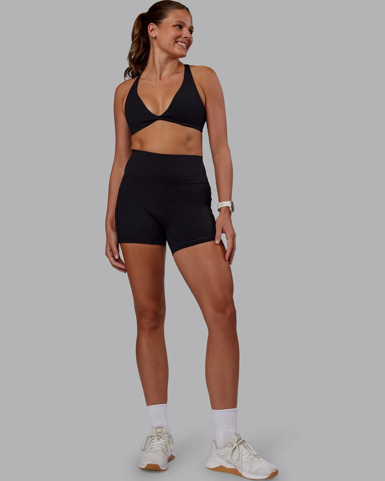 The relaxed everyday fit. Black Sports Bra with a twist design bust detail and a roulette back strap design made with our signature multi-directional stretch Rep Fabric. Featuring moisture wicking properties and a double lined front – no padding needed. Agile is designed for those low intensity workouts, with maximum breathability and a unique look to rock with any of our leggings.