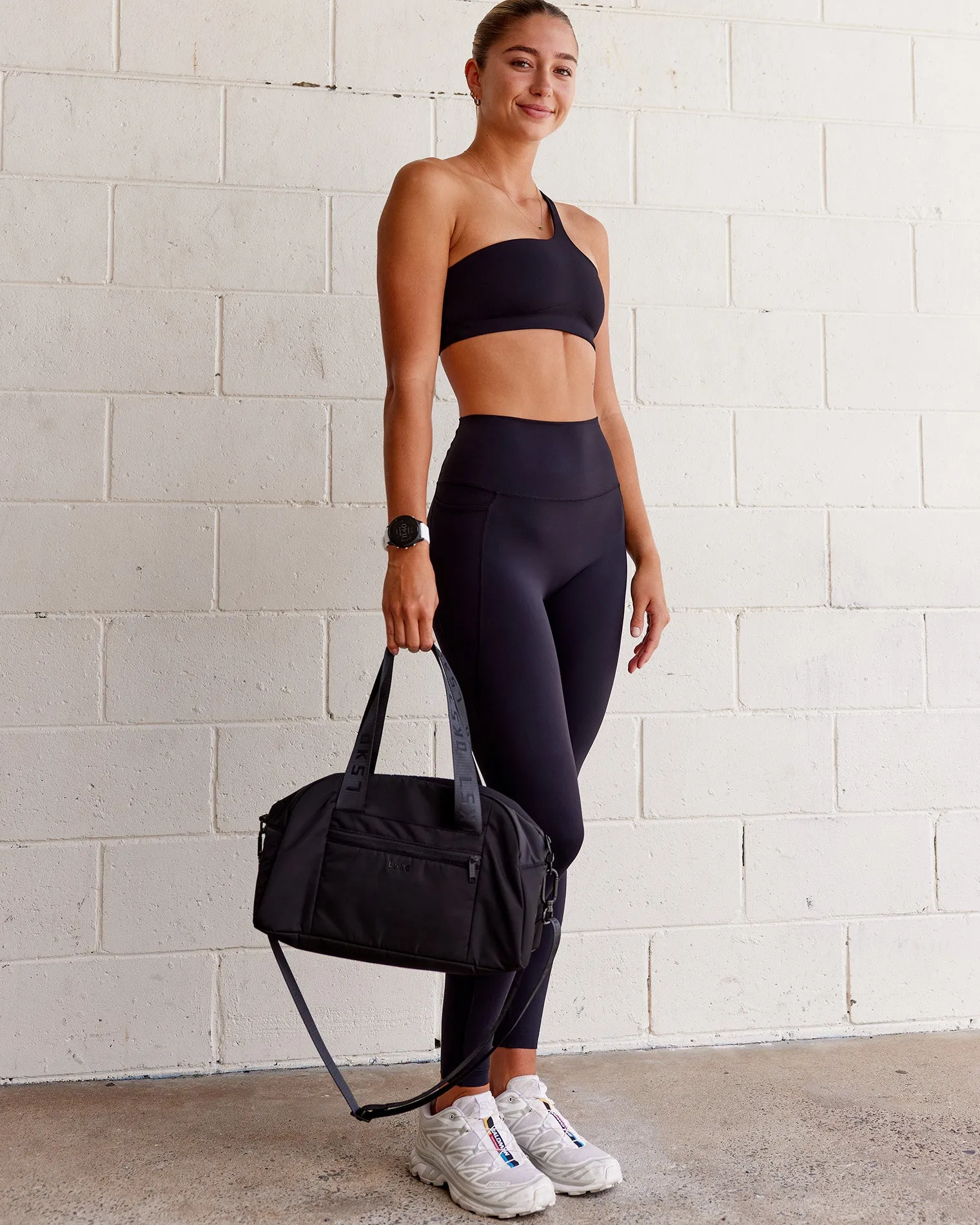 Turn heads with the bandeau-inspired Black Angle Sports Bra. Featuring a sleek silhouette and striking asymmetric shoulder strap. Designed for light support and effortless style – perfect for studio sessions or layering into your athleisure look.