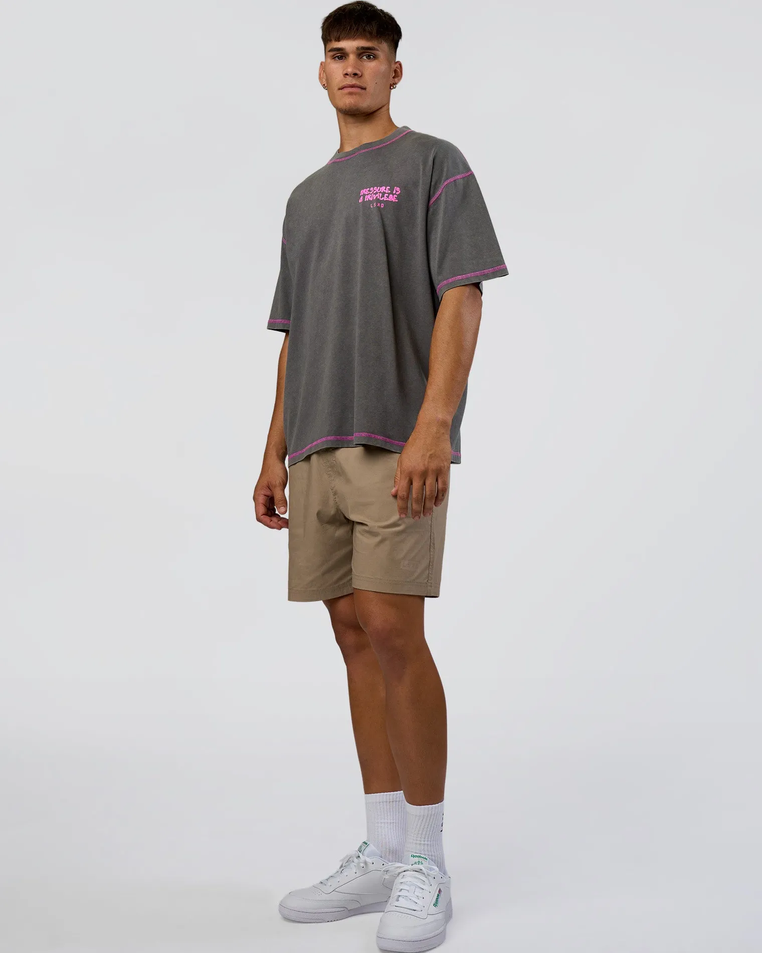 The Dark Storm Washed-Ultra Fuchsia Pressure Is Privilege Tee is designed for a relaxed oversize fit in our durable heavyweight cotton, an essential for the effortless street look.