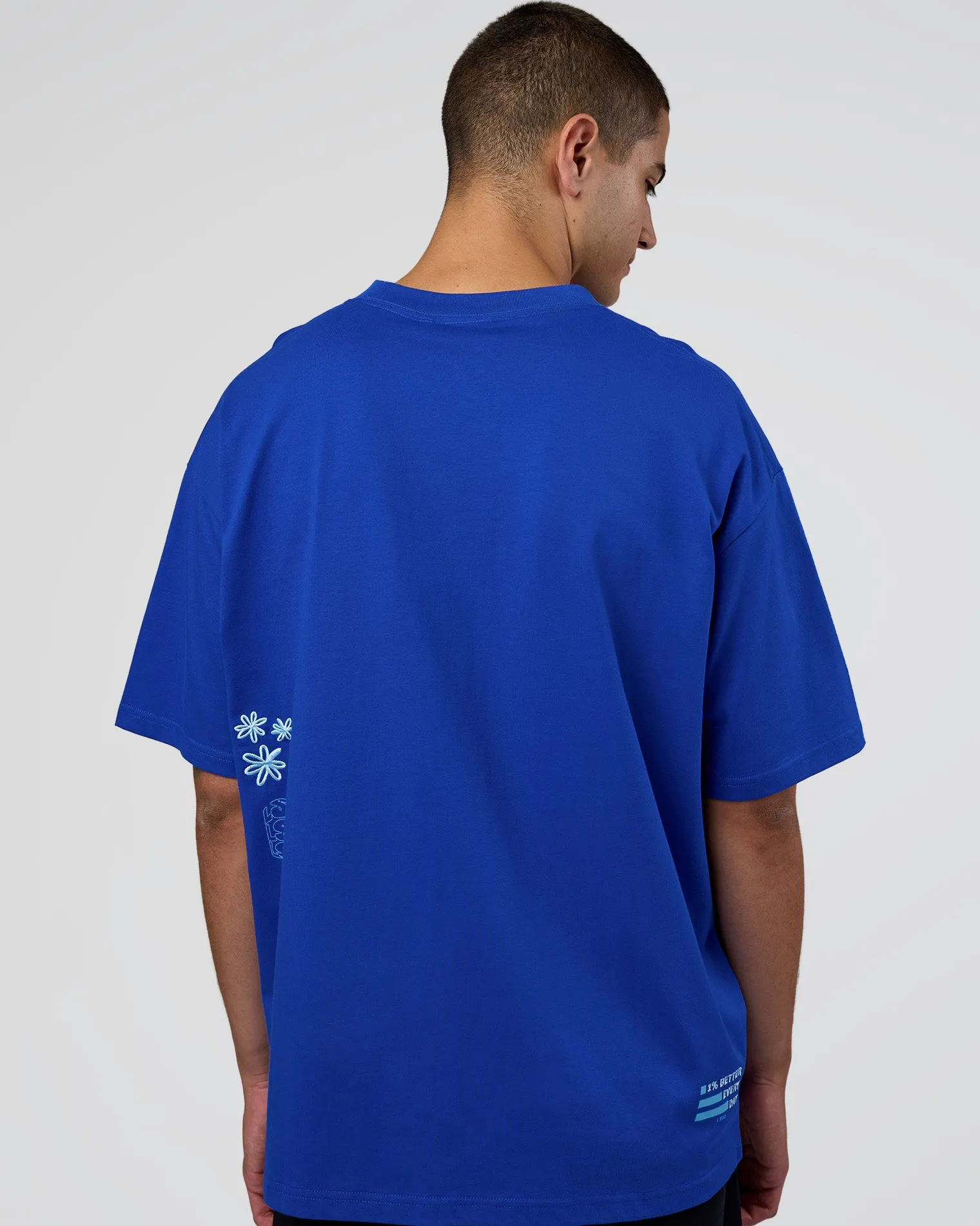 The Electric Indigo-Baltic Sea Sticker Tee is designed for a relaxed oversized fit in our durable heavyweight cotton. An essential for the effortless street look.