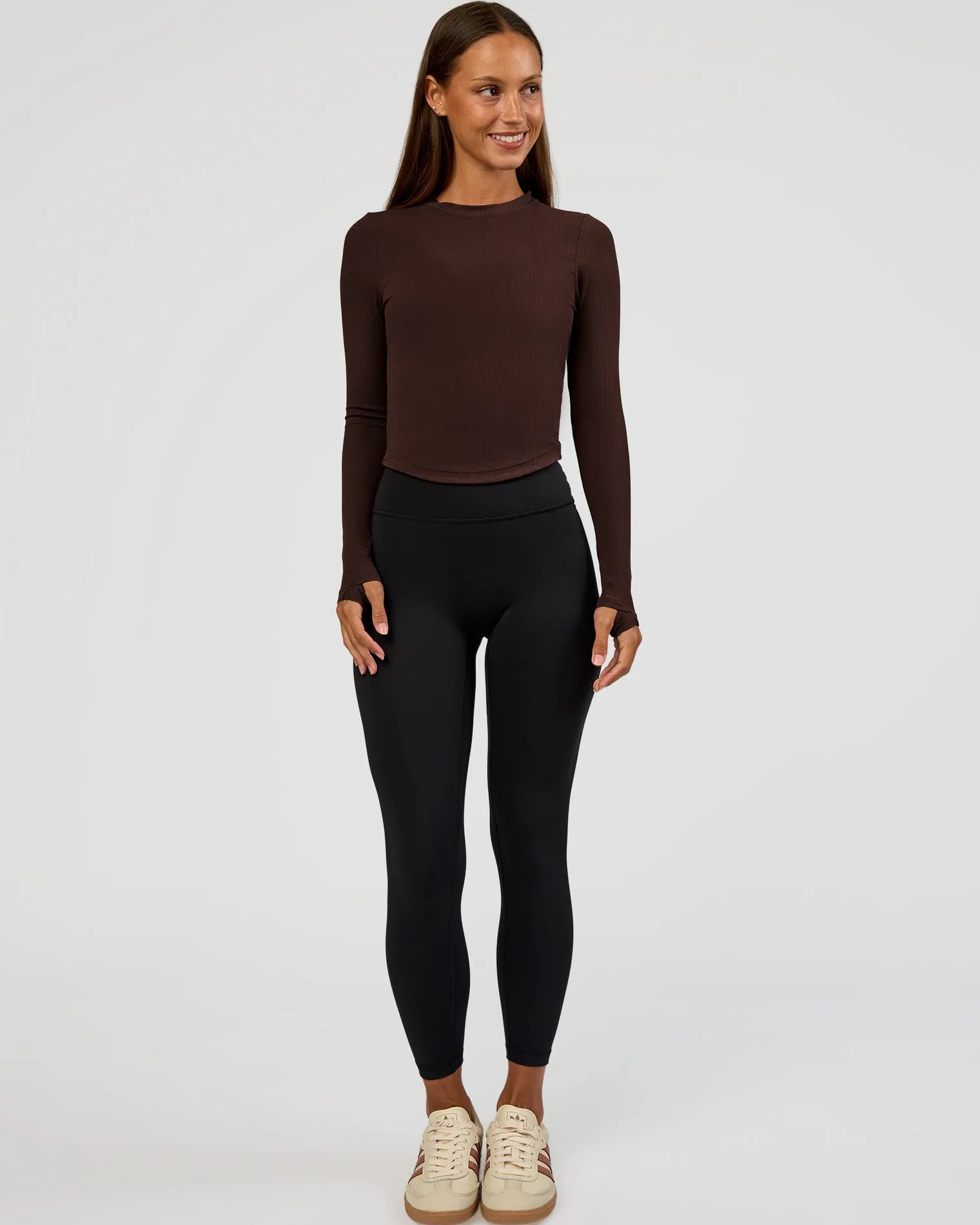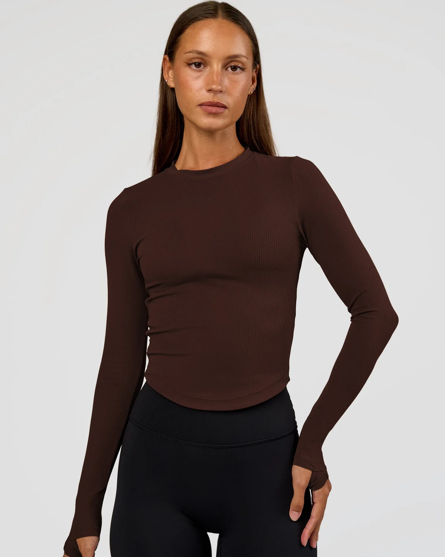 Your new favourite Flow Long Sleeve in our luscious Hot Chocolate Rib Fabric. Designed with a classic silhouette, flattering high neckline and long sleeves with thumbholes. Flow is made fro all performance levels and activities.