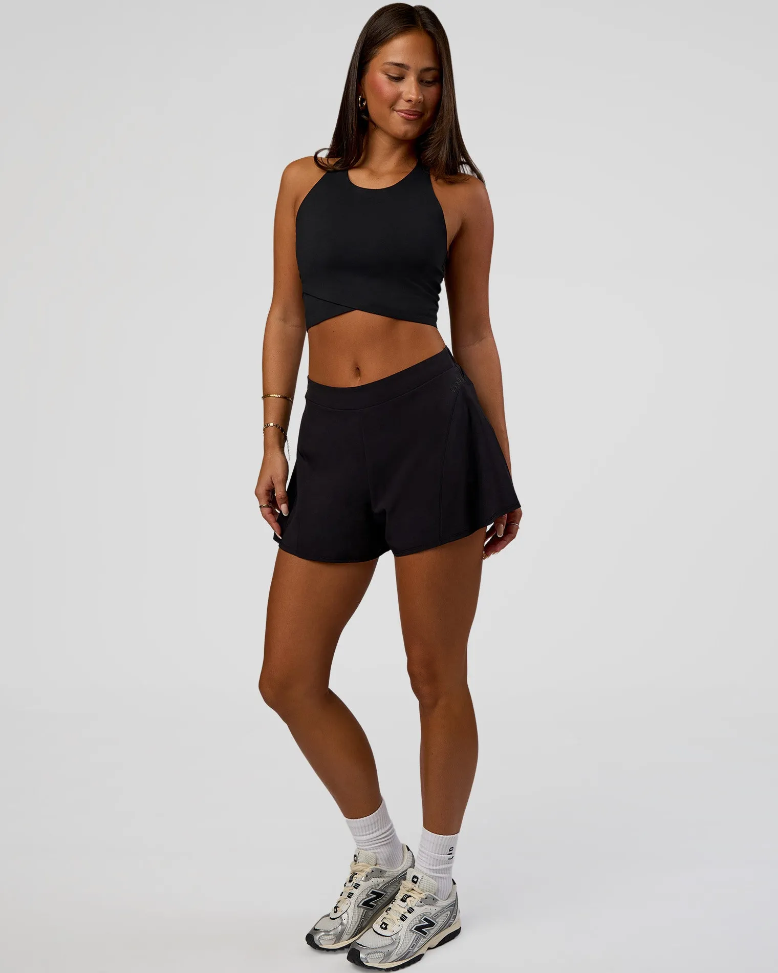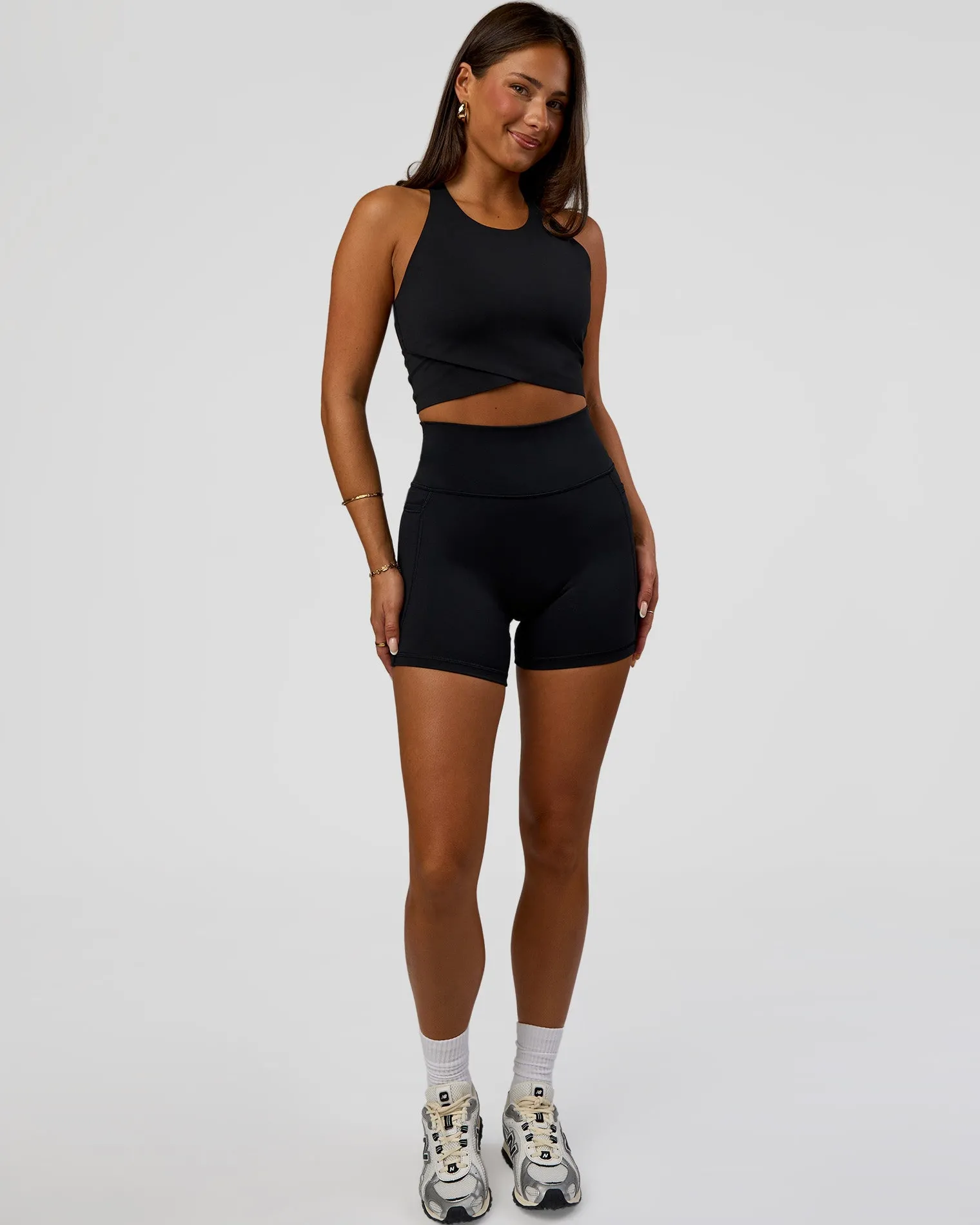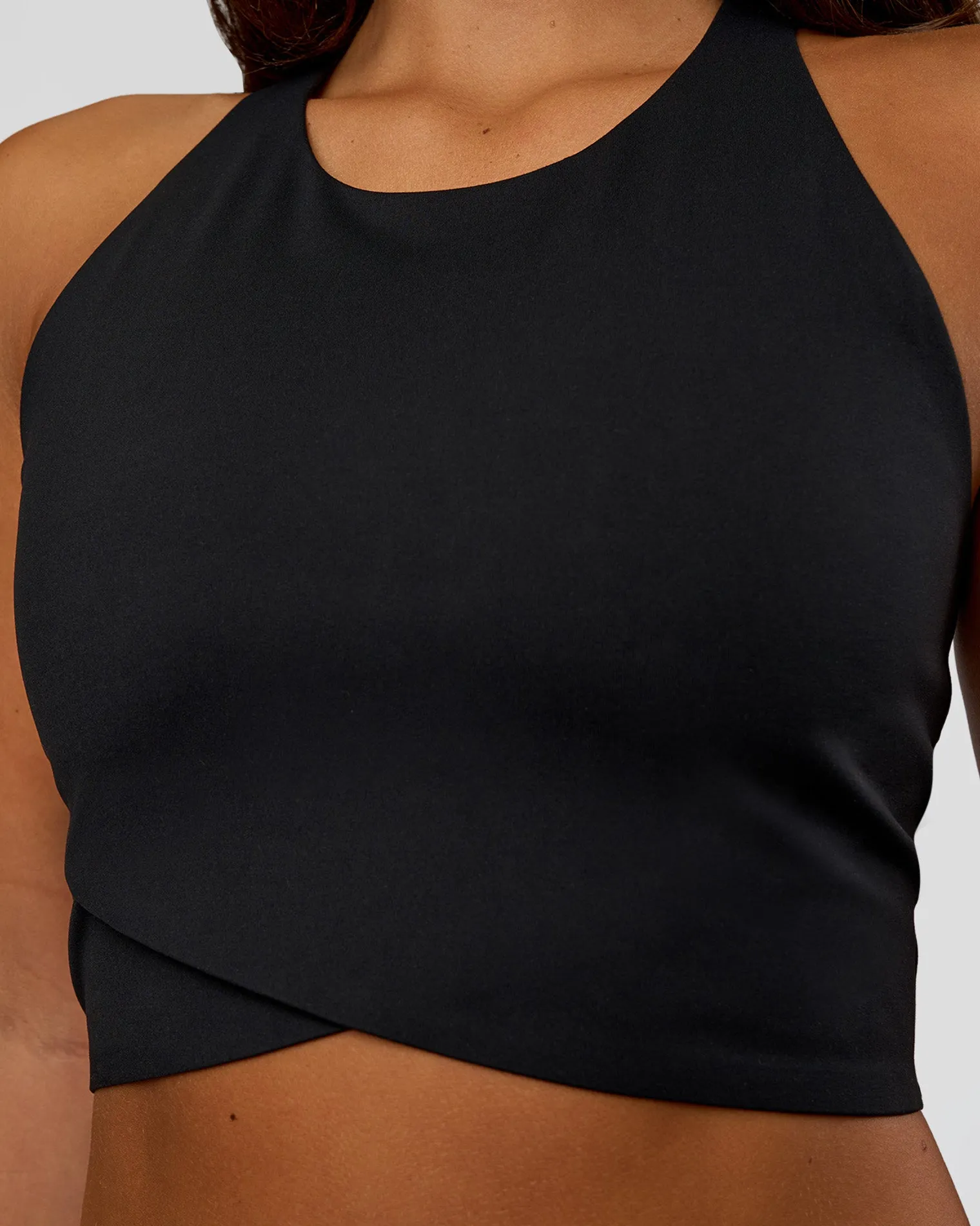 Designed as performance and style redefined. The Black Hybrid Performance Crossover Tank is made from recycled polyester, with bonded seams for gently held in and smooth silhouette. The classic silhouette features a racer back and crossover hem designed to meet the top of your leggings.