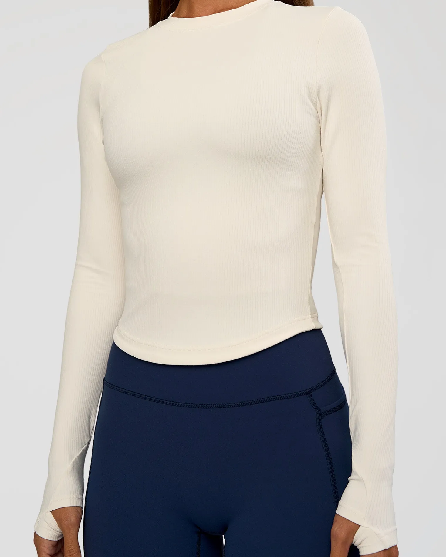 Your new favourite Flow Long Sleeve in our luscious Off White Rib Fabric. Designed with a classic silhouette, flattering high neckline and long sleeves with thumbholes. Flow is made fro all performance levels and activities.
