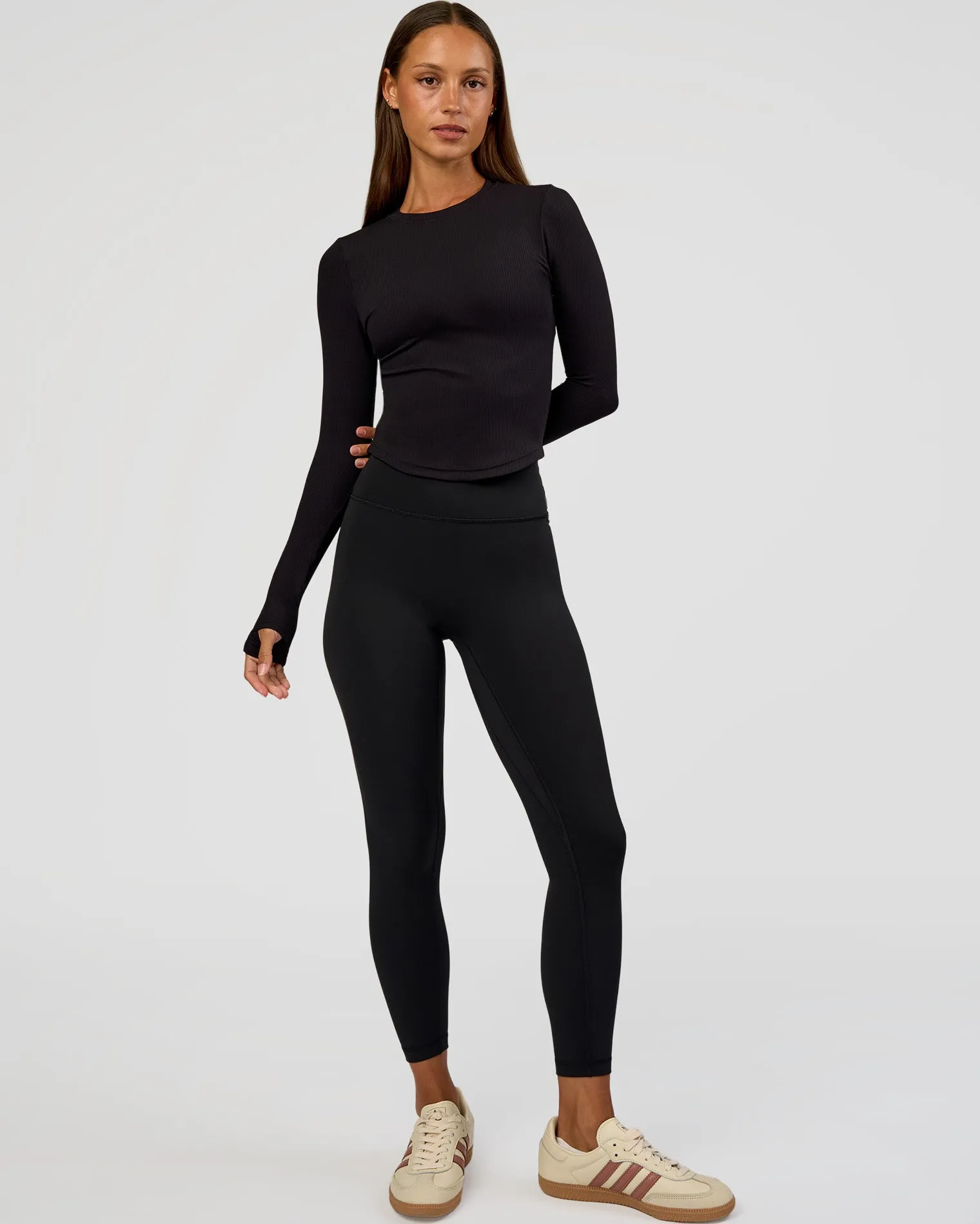 Your new favourite Flow Long Sleeve in our luscious Black Rib Fabric. Designed with a classic silhouette, flattering high neckline and long sleeves with thumbholes. Flow is made fro all performance levels and activities.
