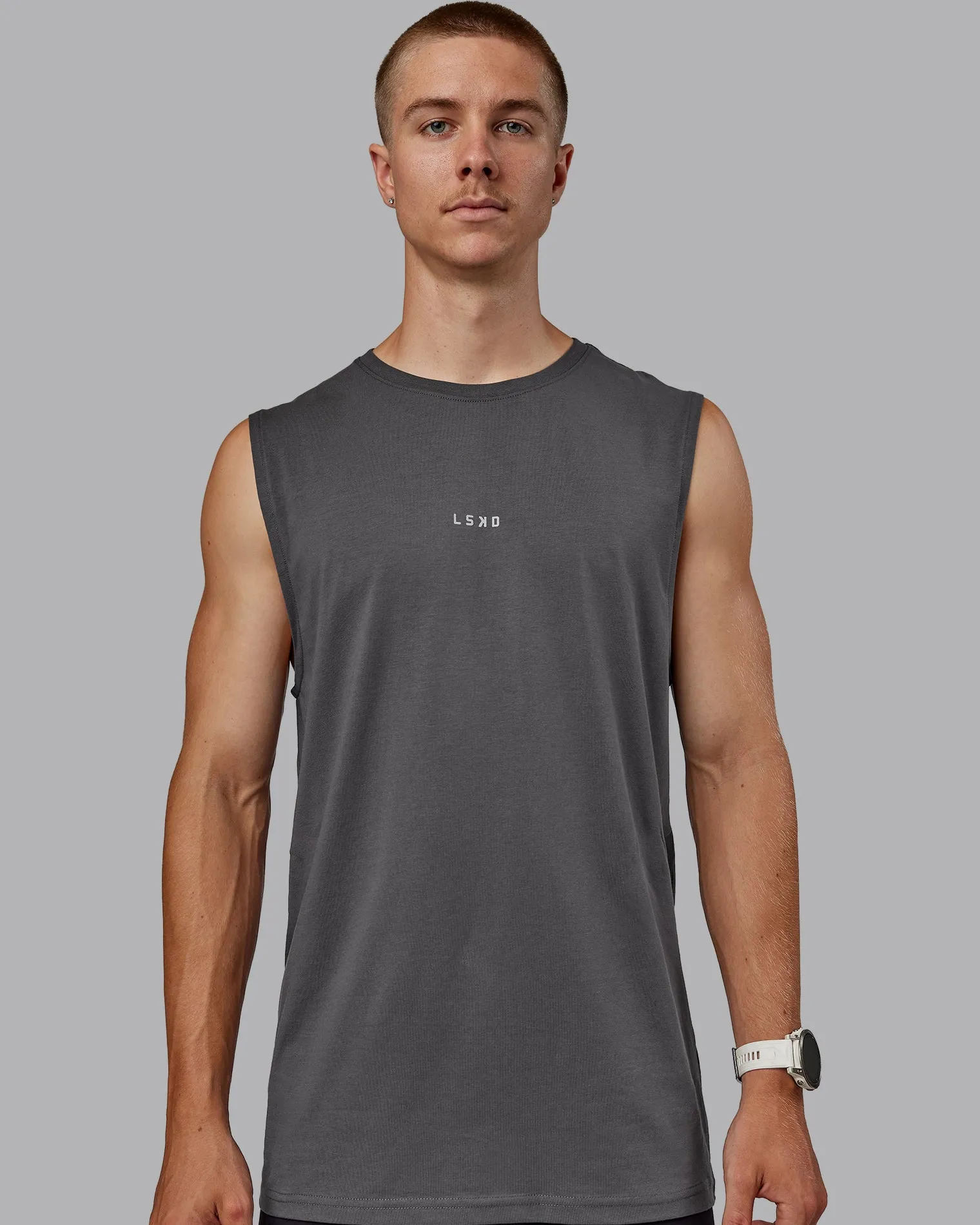 Bring it back to basics. A dark storm tank in one of our most popular performance x street styles for men. A clean basic design ready for everyday wear but tried and tested to perform under pressure with our signature FLXCotton fabric using spandex yarns woven with soft cotton for added stretch so you can move like you.