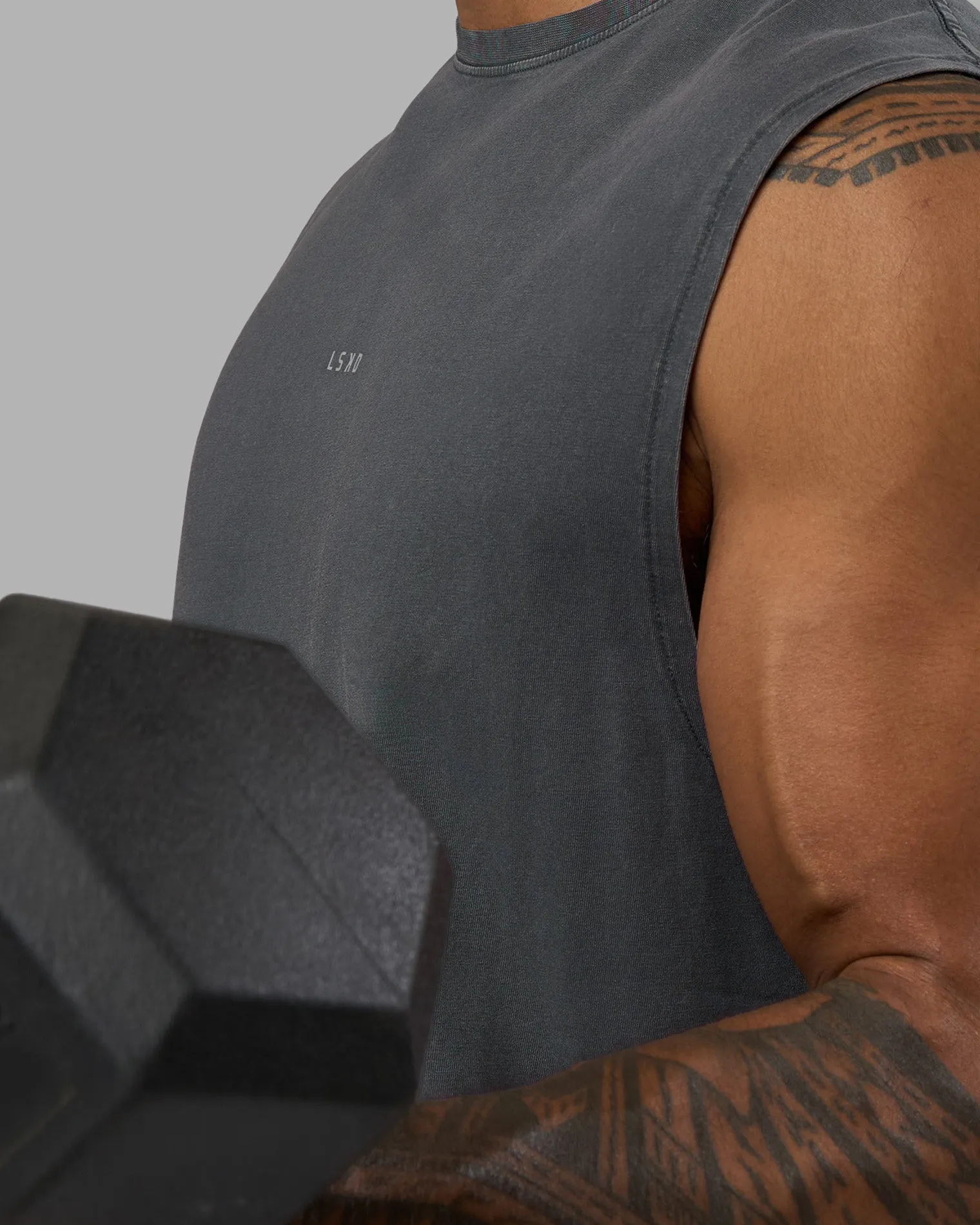Bring it back to basics. A dark storm washed tank in one of our most popular performance x street styles for men. A clean basic design ready for everyday wear but tried and tested to perform under pressure with our signature FLXCotton fabric using spandex yarns woven with soft cotton for added stretch so you can move like you.