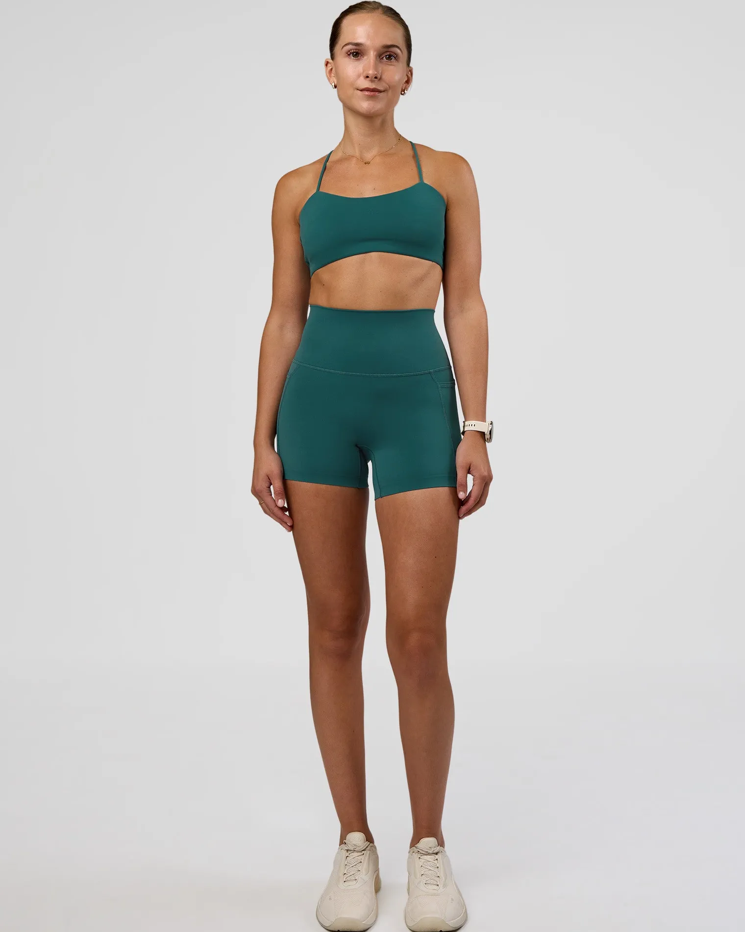 Designed with a classic silhouette complemented by delicate straps with a twist. The Transformative Teal Twister Sports Bra is a thoughtful design that ensures a distraction-free workout, combining intricate detailing and comfort.
