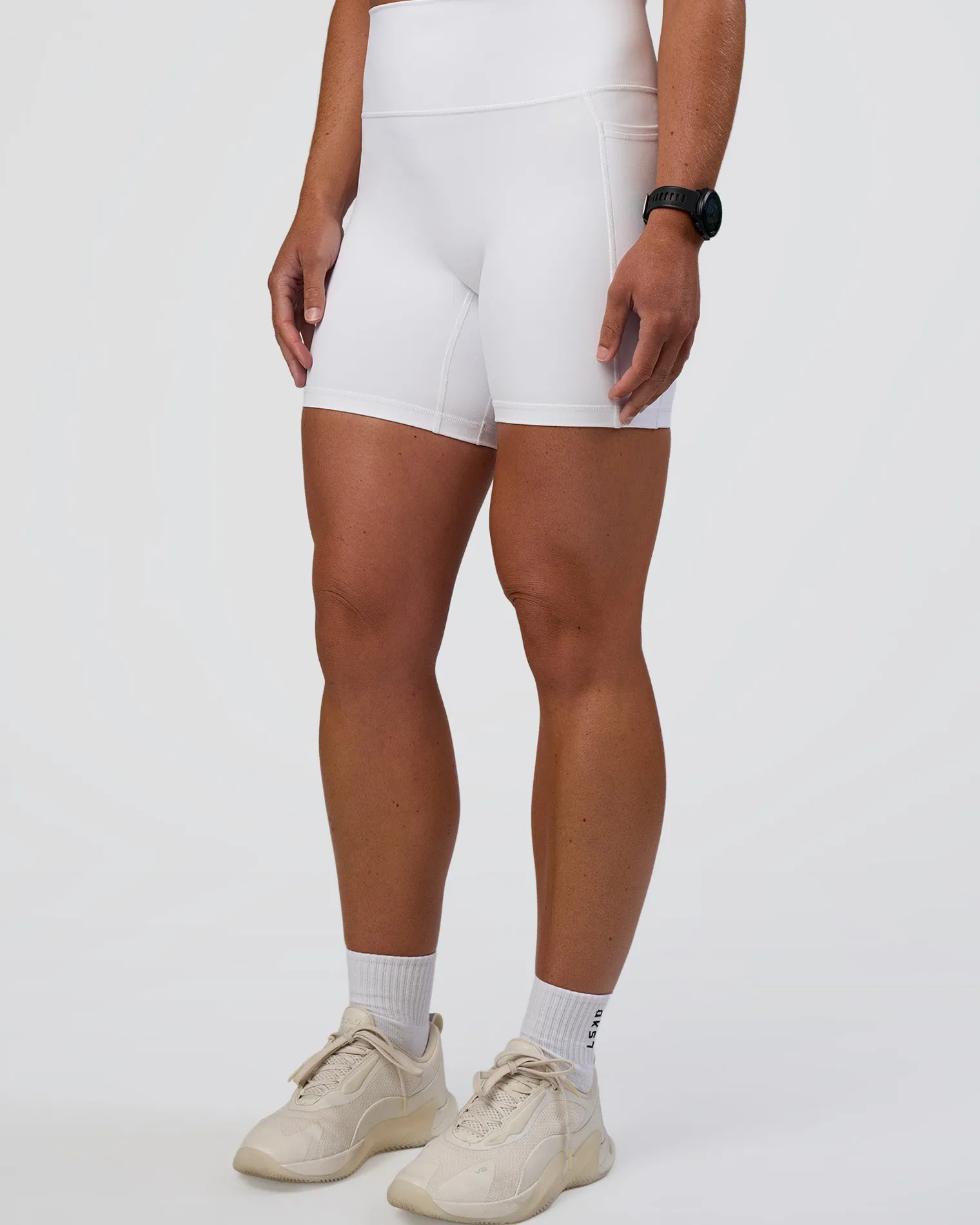 The same Fusion Mid Short Tights with Pockets you know and love, just with a name upgrade! These White Fusion Ultra High-Rise 6″ Shorts With Pockets combine features from four of our beloved legging styles. Fused with all the good stuff, including a high rise fold over waistband, side pockets, 4-way stretch Rep fabric and we’ve removed the front seam for a comfortable, supportive fit. When it comes to versatile training, Fusion is your go to for all round performance.