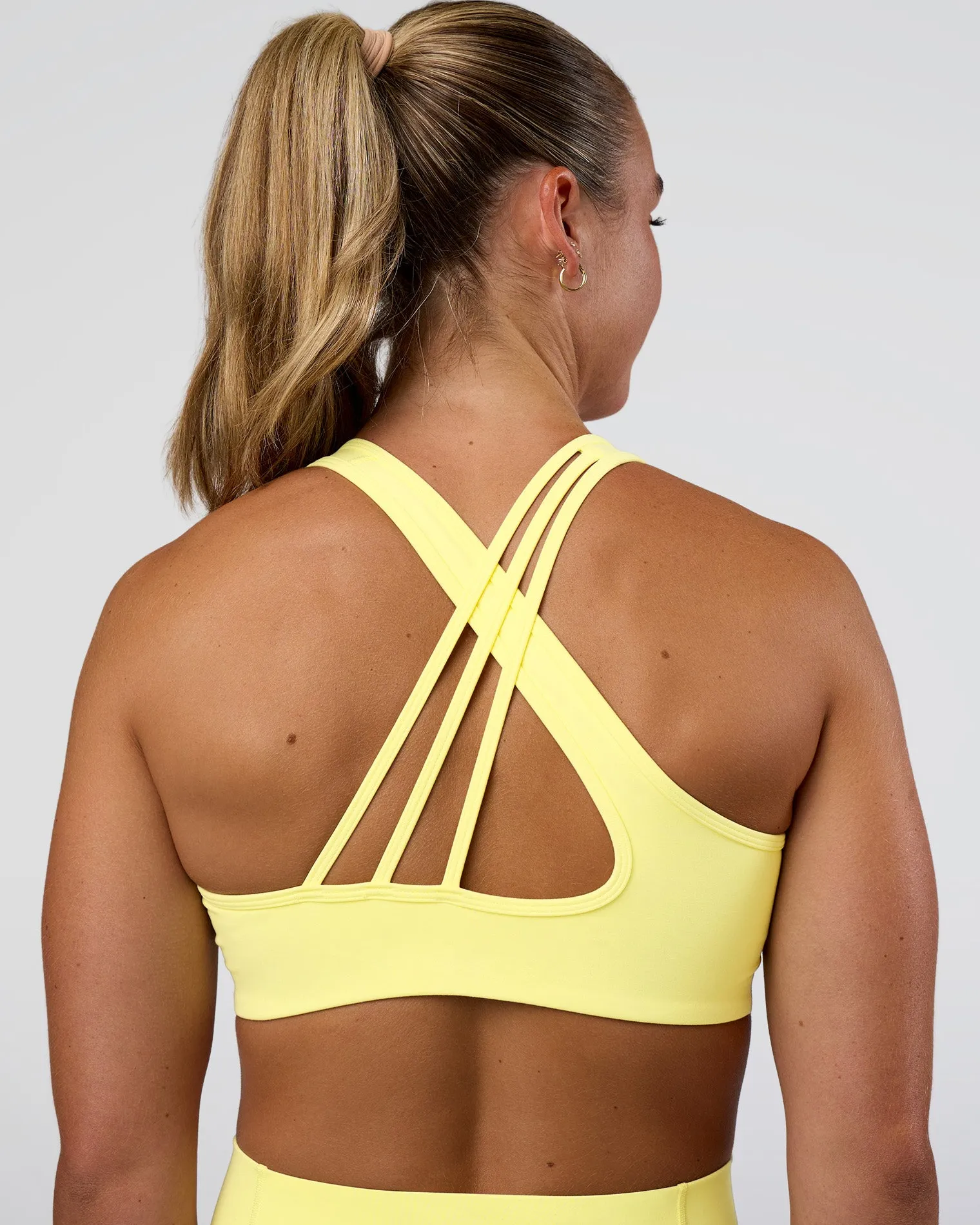 Unmatched comfort and confidence when wearing the Yellow Fizz Stamina Rise Sports Bra. This asymmetric style combines a flattering neckline with intricate back strap details. Ideal for light to medium intensity workouts.