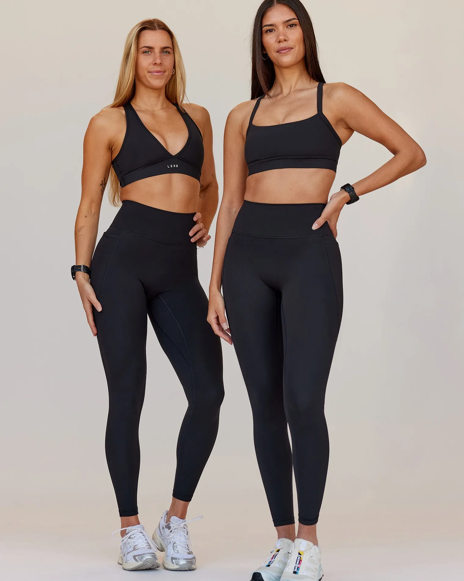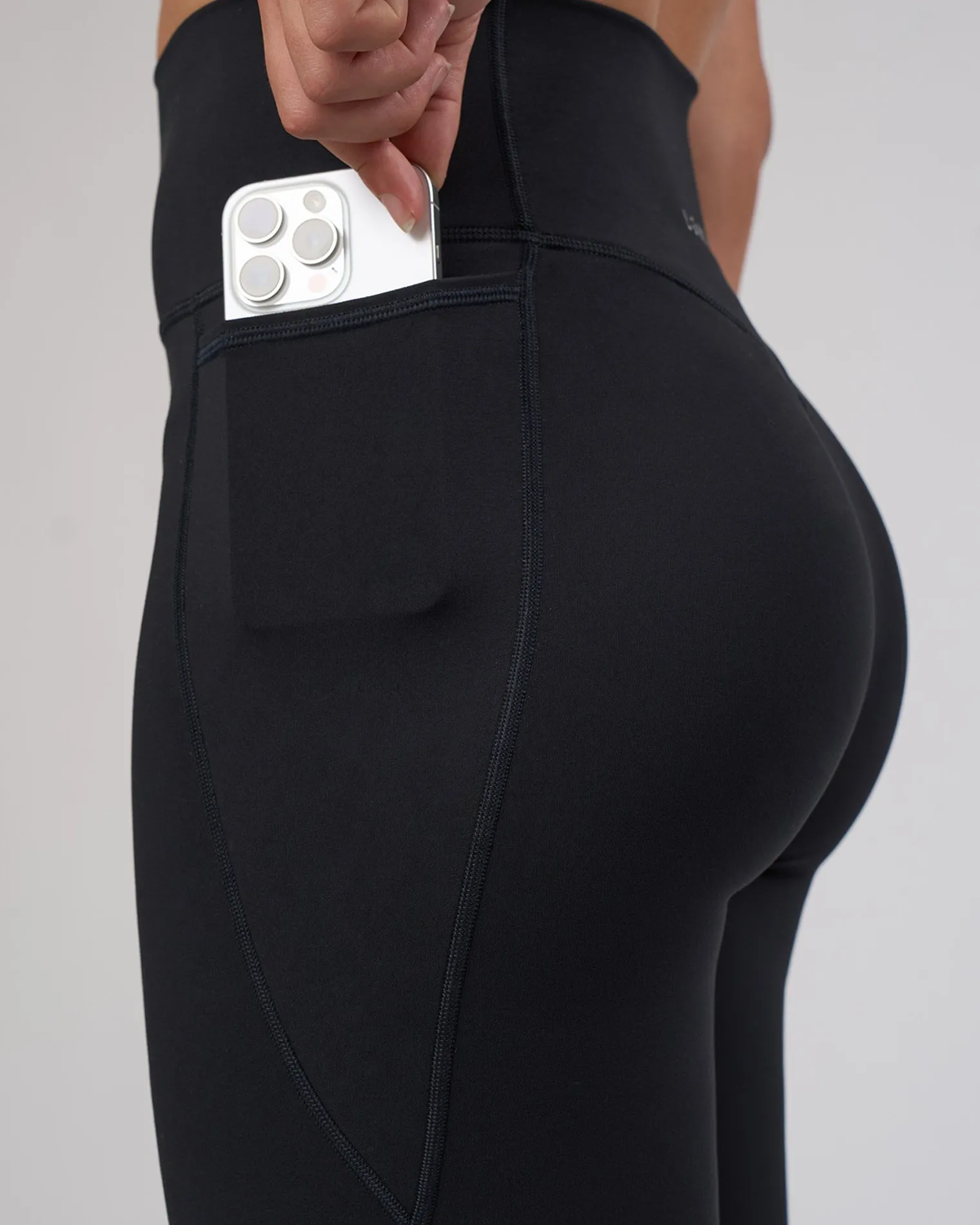 These Black Full Length Leggings are the same Fusion with Pockets you know and love – reimagined with a V-Shaped back yoke designed to enhance the natural curves of the body. This expertly tailored seam creates a contoured fit, lifting and shaping the rear for a flattering silhouette.