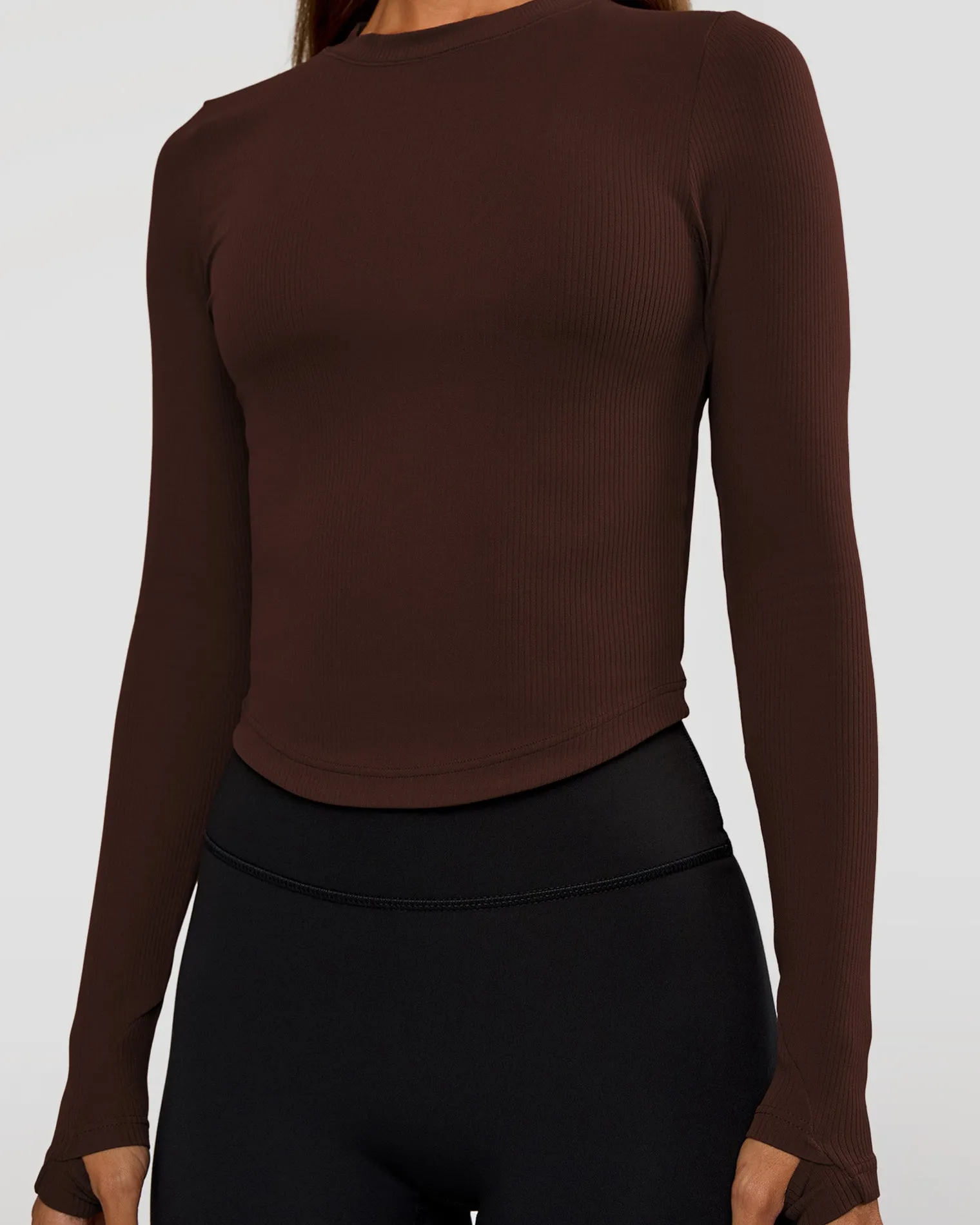 Your new favourite Flow Long Sleeve in our luscious Hot Chocolate Rib Fabric. Designed with a classic silhouette, flattering high neckline and long sleeves with thumbholes. Flow is made fro all performance levels and activities.