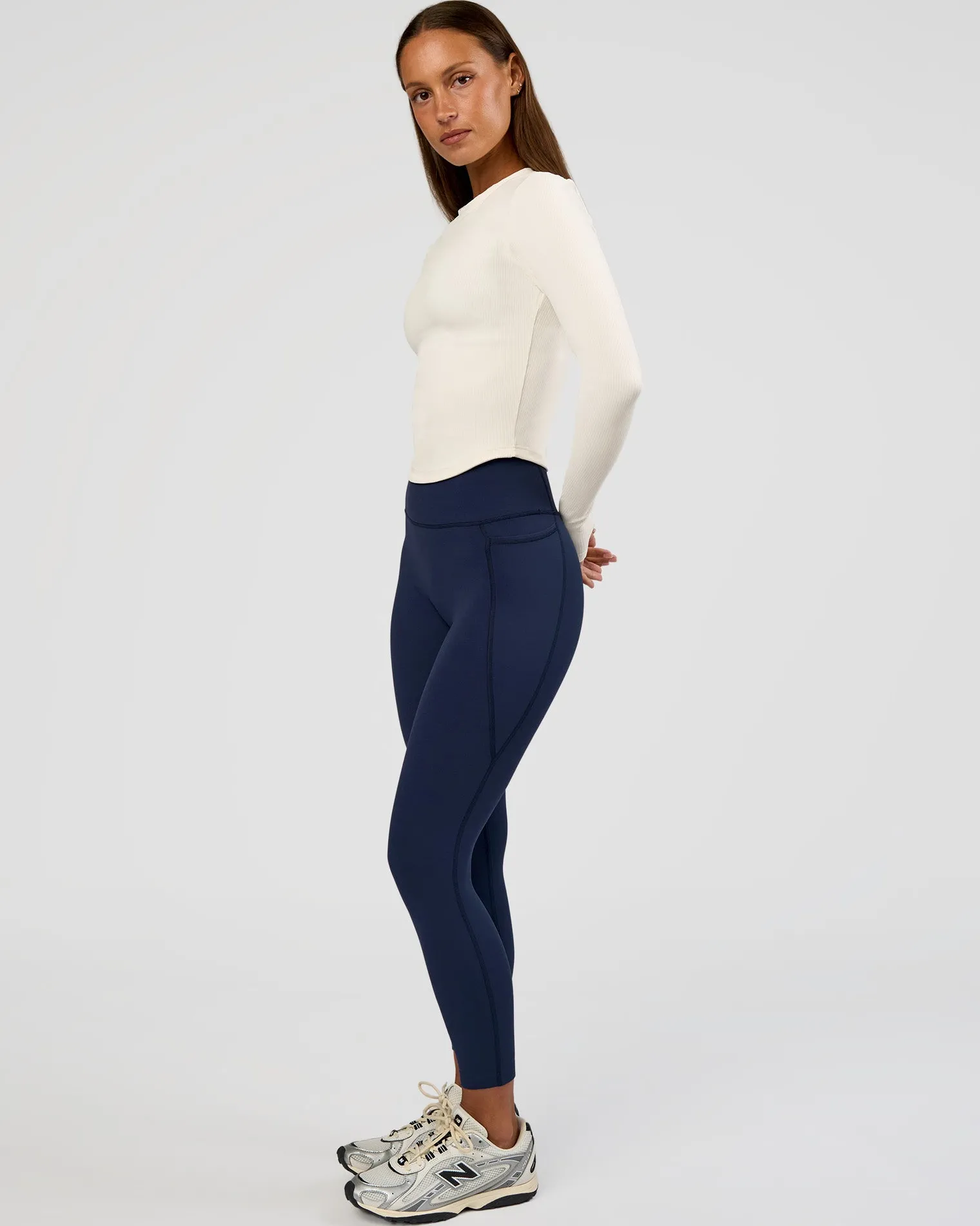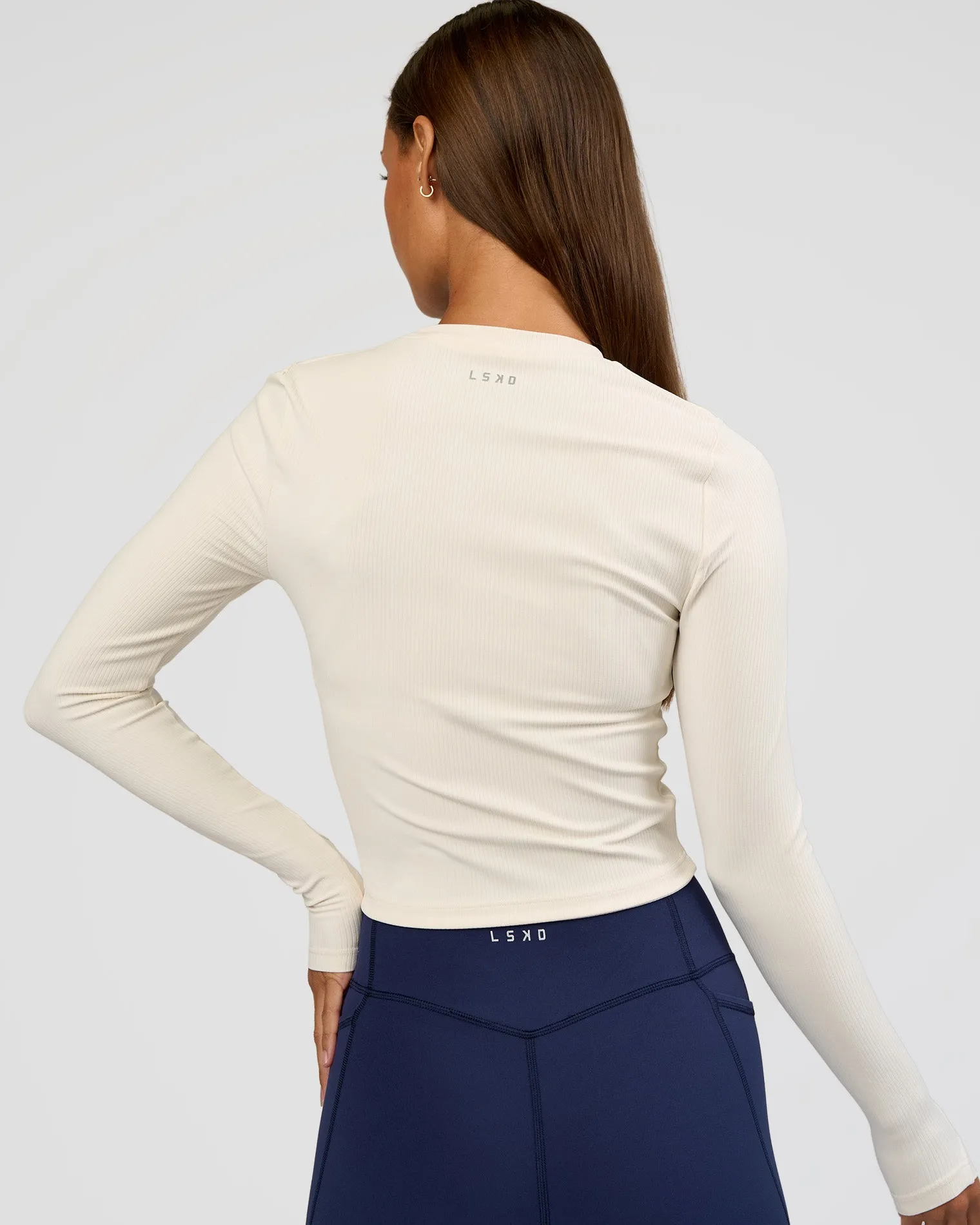 Your new favourite Flow Long Sleeve in our luscious Off White Rib Fabric. Designed with a classic silhouette, flattering high neckline and long sleeves with thumbholes. Flow is made fro all performance levels and activities.