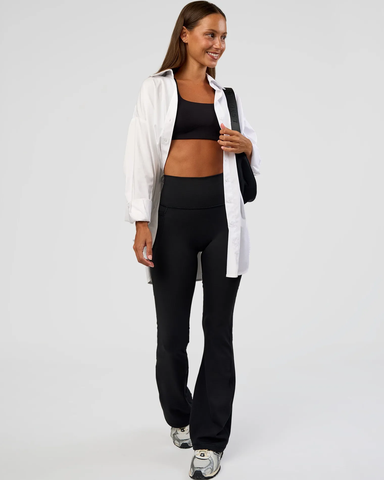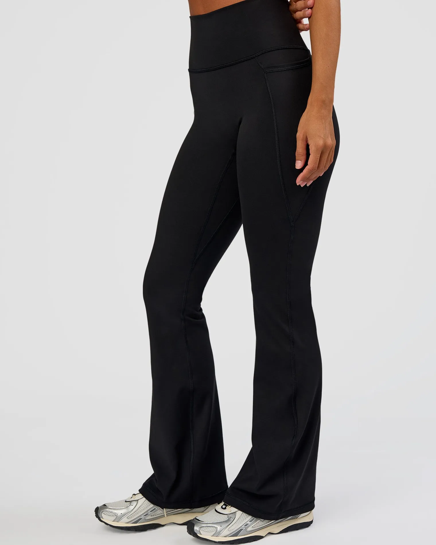 The same Everyday Flare Tights you know and love just in a petite fit for the shorter gals, side phone pockets and a name upgrade! These Black Fusion Ultra High-Rise Flared Petite Leggings With Pockets have a natural synergy of performance and everyday comfort. Made with our signature REP Fabric with some of the winning features of our Fusion Leggings, such as a high-rise foldover waistband and no centre-seam PLUS an added flare from the knee. Perfectly suited for mild flow and stretch workouts and a versatile addition to your everyday wardrobe.