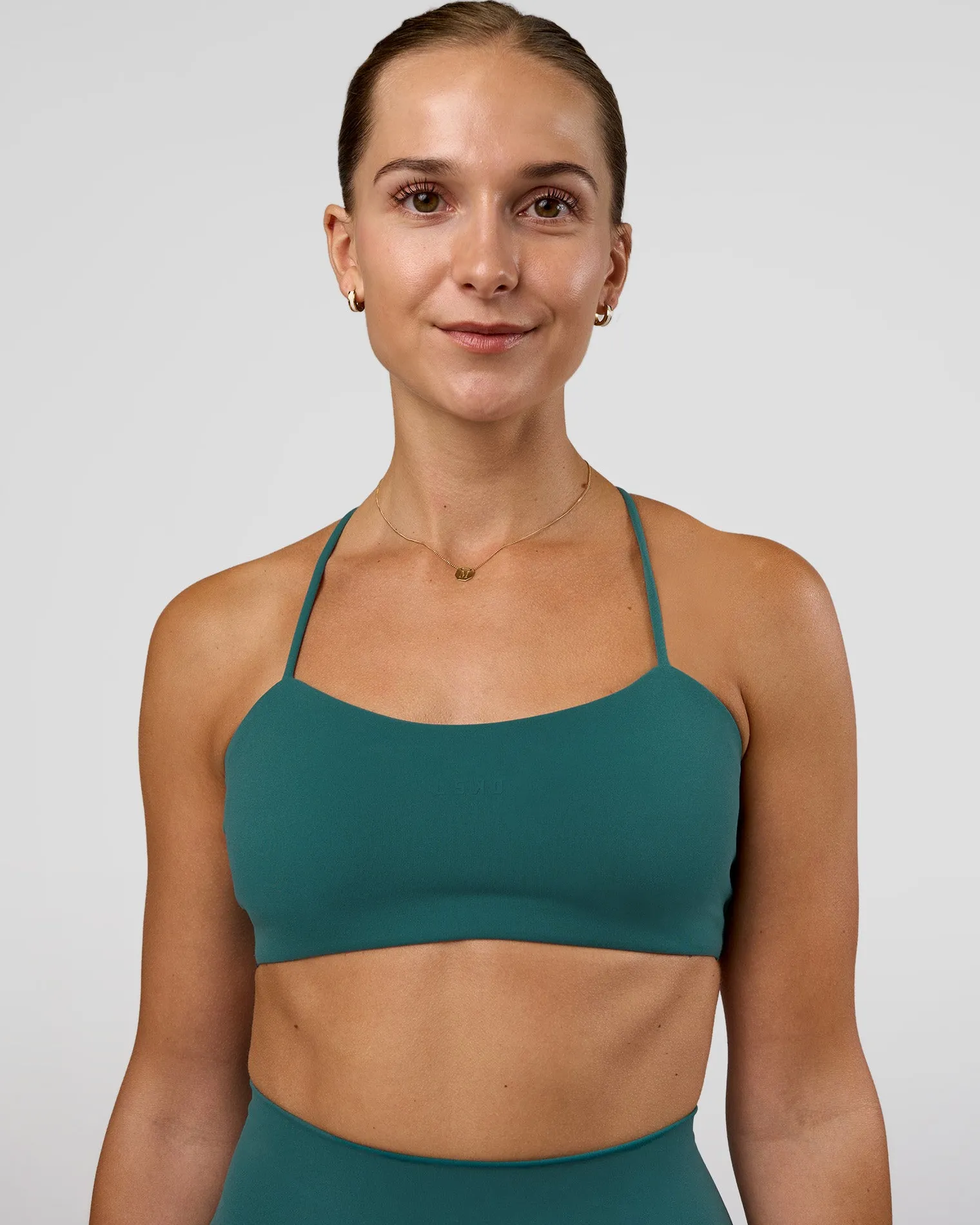 Designed with a classic silhouette complemented by delicate straps with a twist. The Transformative Teal Twister Sports Bra is a thoughtful design that ensures a distraction-free workout, combining intricate detailing and comfort.